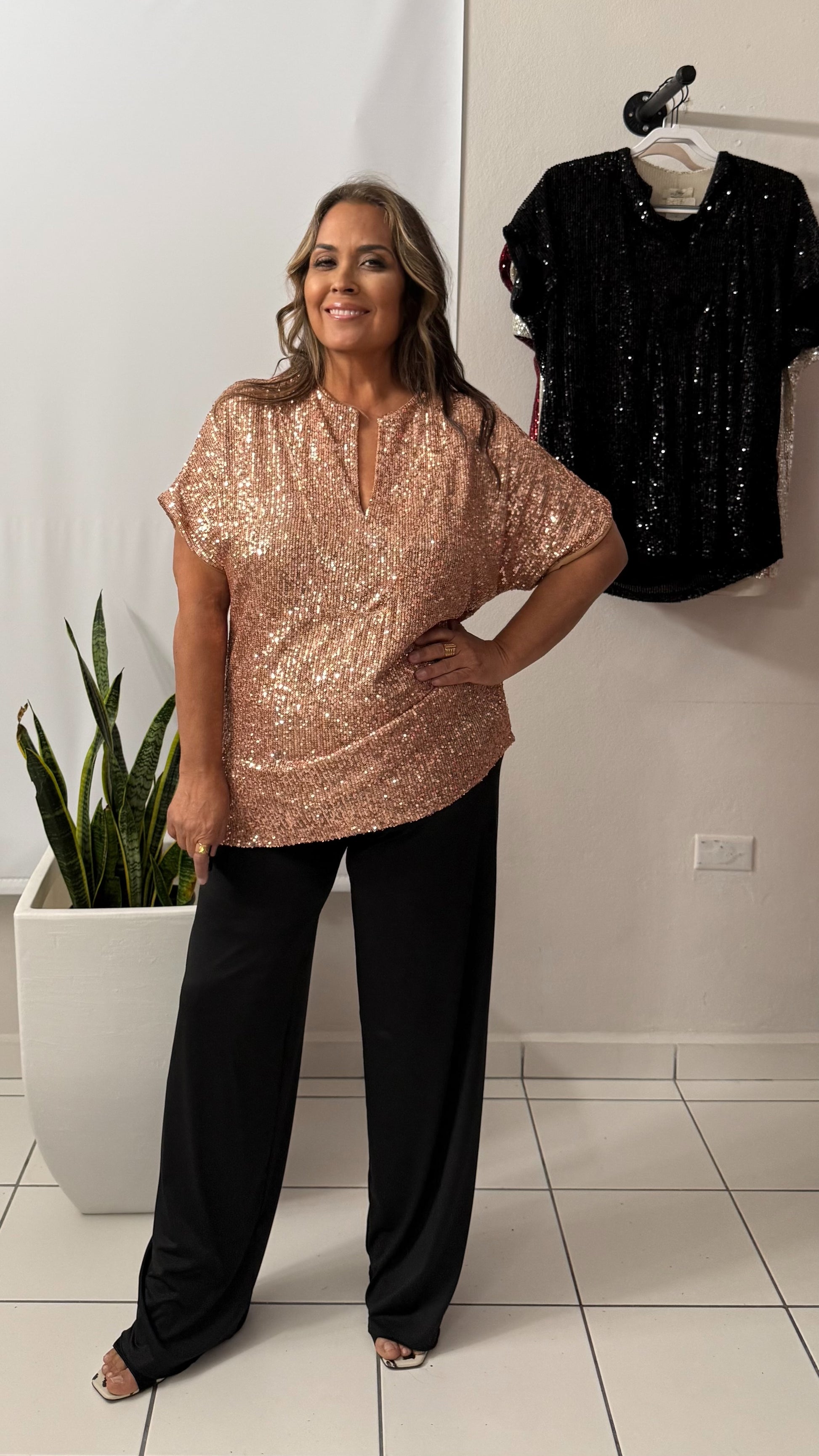A piece from the Italian collection, this blouse is crafted entirely in sequins, offering an elegant shine without looking overdone. It features a flattering V-neckline and a mid-arm sleeve, perfect for a comfortable yet sophisticated look. Available in four colors, it’s an ideal choice for the holiday season, adding a festive and chic touch to any outfit.