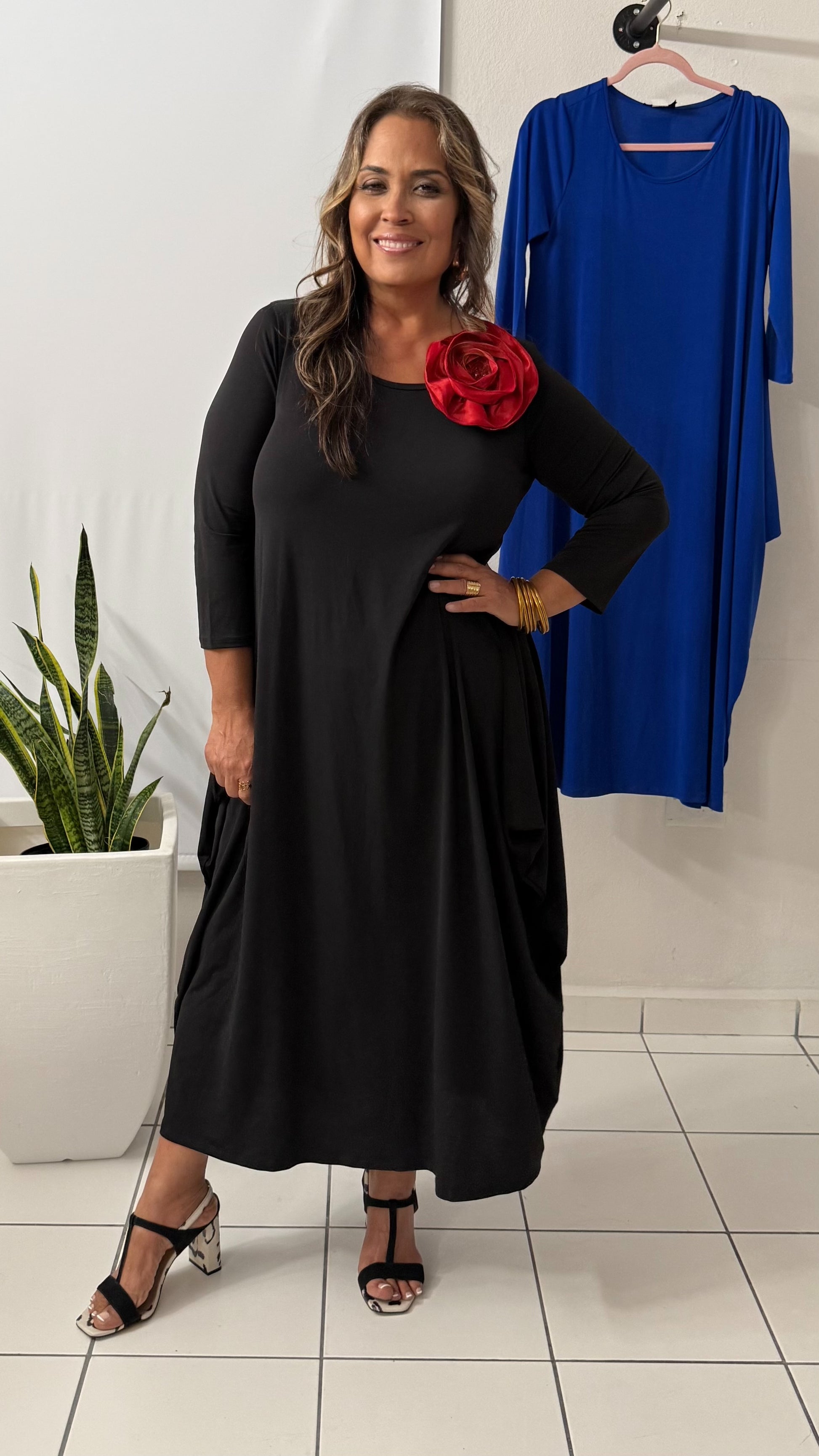 This long-sleeve midi dress with a round neckline stands out for its slimming visual effect. Its design defines the waist for a smaller silhouette, while the exterior pocket-style, balloon-like detail at the hips adds volume and enhances the figure.