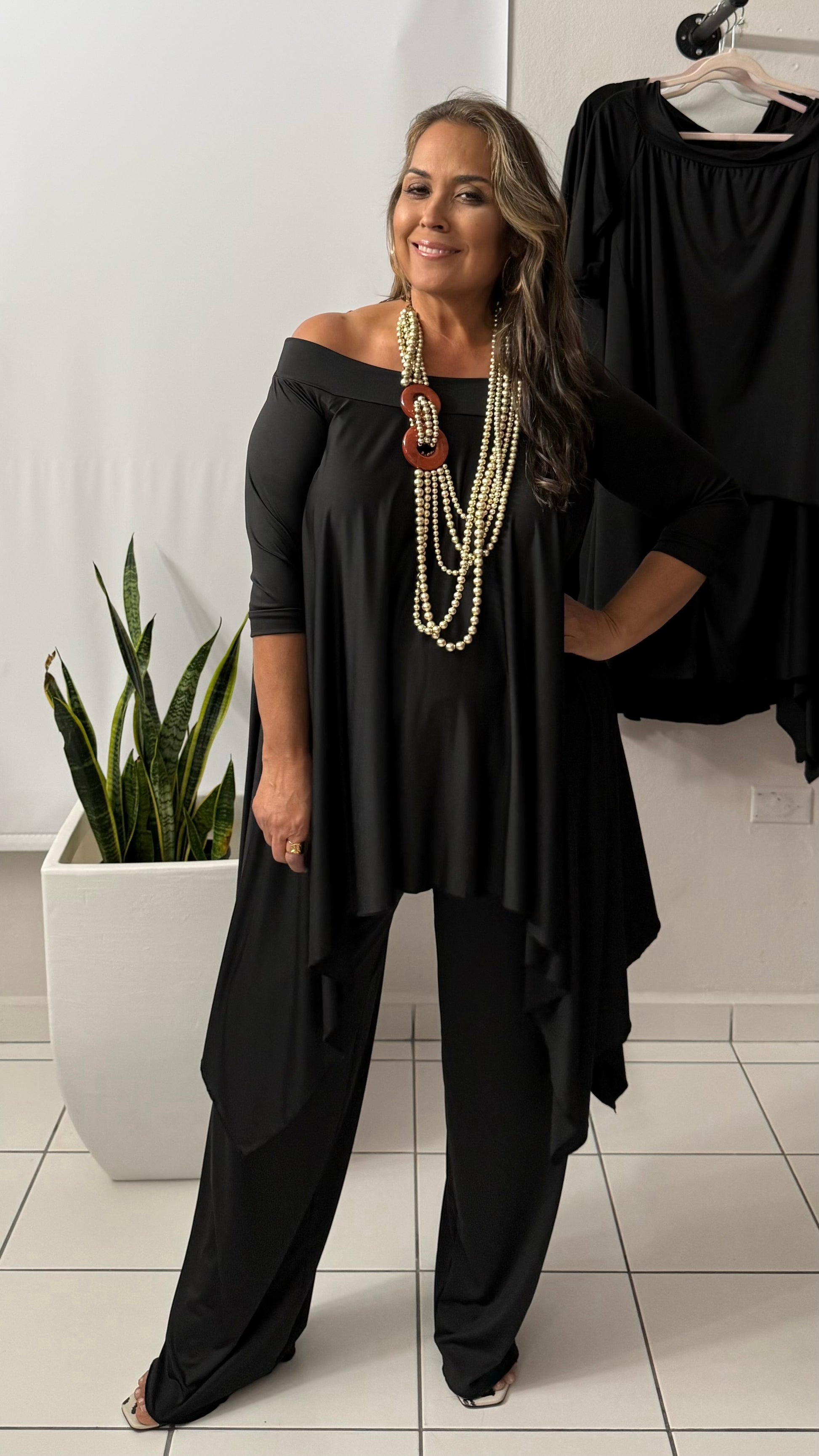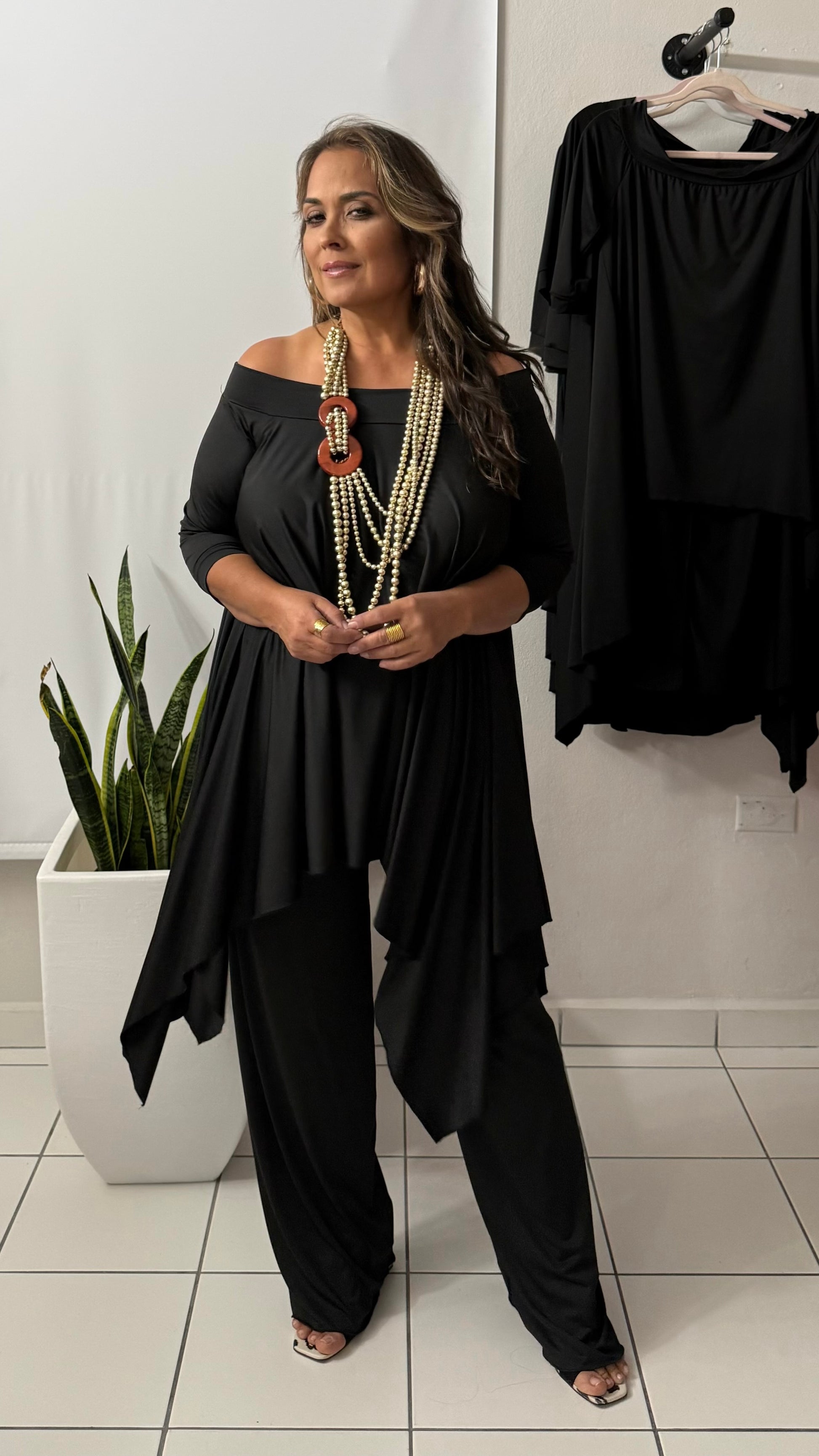 Túnica de picos. Off shoulder. Pantalón de pata ancha, con elástico en la cintura.
